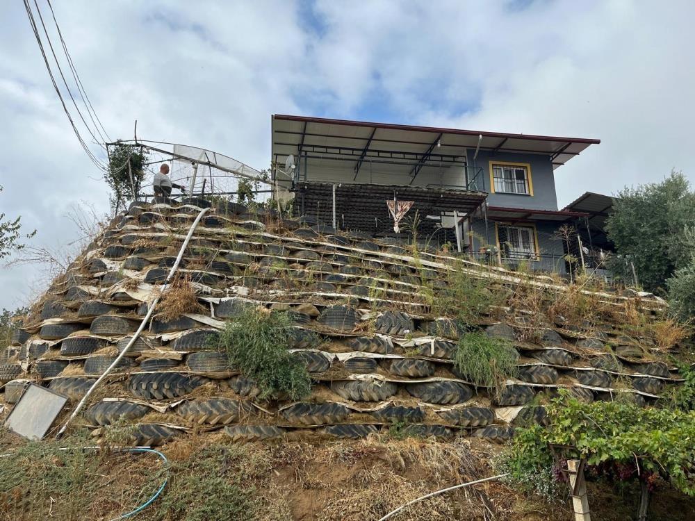 Beton set duvar yerine maliyeti daha az olan üç tır dolusu ömrünü tamamlamış traktör ve kamyon lastiğiyle kale gibi bir duvar ören Tosun, hem evini korudu hem de geri dönüşüme örnek oldu.