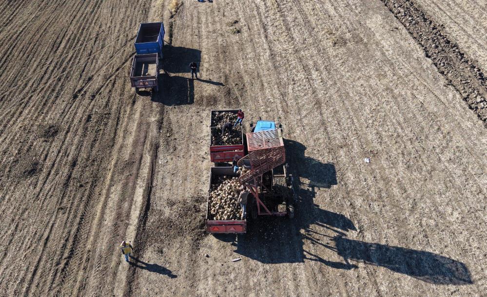 Yağmura ve soğuğa aldırmadan çalışmalarını sürdüren üreticiler, gün boyunca pancar sökümü, yükleme ve taşıma işlemleriyle uğraşırken, zorlu hasat süreci adeta bir dayanışma örneğine dönüşüyor. Geniş pancar tarlalarındaki hummalı çalışma dron ile havadan görüntülendi.