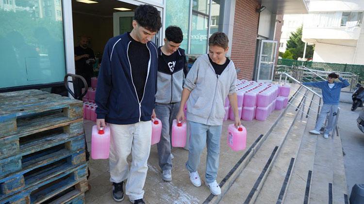 KYK yurtları ve gençlik merkezlerine verilmek için çamaşır suyu, yüzey, temizleyicisi ve sıvı el sabunu gibi temizlik malzemesi üreten lise çalışmalarını sürdürüyor.