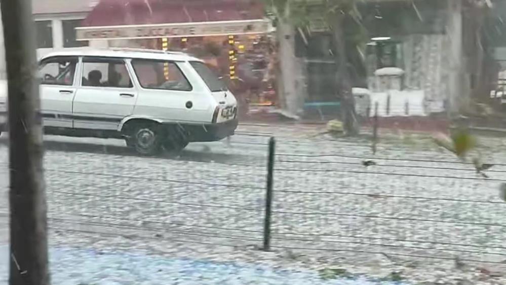 Çaycuma ilçesinde öğle saatlerinde çıkan fırtına sonrası ceviz büyüklüğünde yağan dolu, ilçeyi beyaza bürüdü.