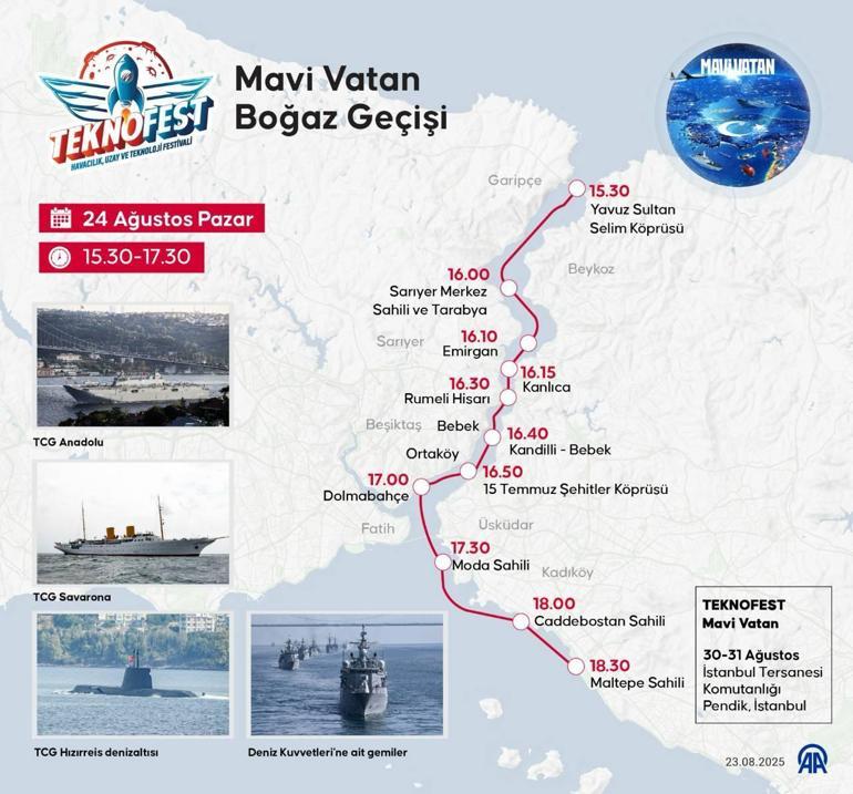 TEKNOFEST'ten yapılan açıklamaya göre, Cumhurbaşkanlığı himayelerinde ve Milli Savunma Bakanlığı ev sahipliğinde gerçekleştirilecek etkinlik, milli teknoloji heyecanını İstanbul Boğazı'ndan tüm Türkiye'ye taşıyacak. "Türk bayrağını al, gel" çağrısıyla TEKNOFEST Mavi Vatan Boğaz Geçişi coşkusuna ortak olmak isteyenler Boğaz kıyılarında toplanacak. İzleyiciler, gökyüzü ve denizin kırmızı beyaza boyanacağı unutulmaz anlara tanıklık edecek.