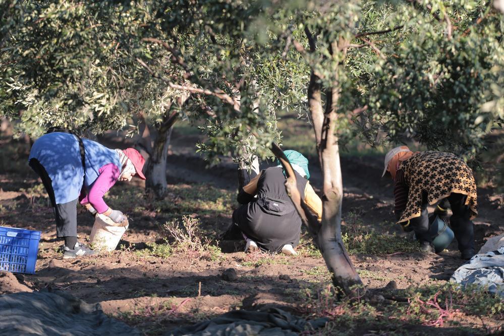 Zeytin toplayıcılarının büyük bir şevkle başladıkları hasatta, zeytinler ağaçların dallarından kadın çiftçiler tarafından elle toplandı.