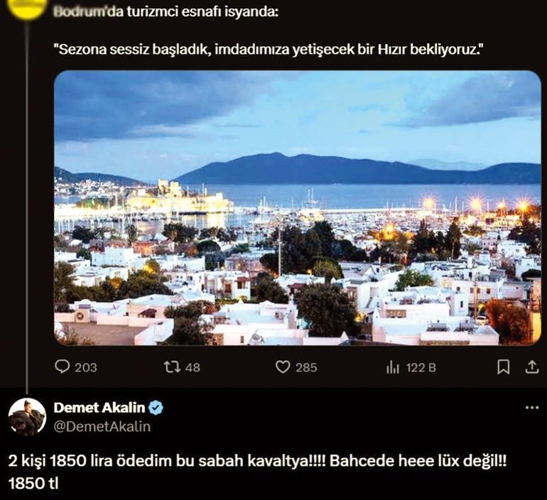 Demet Akalın, Bodrum esnafının “Sezona sessiz girdik” isyanına tepki gösterdi. Yüksek fiyatlara dikkat çeken şarkıcı, iki kişilik kahvaltıya 1850 lira ödediğini söyledi.