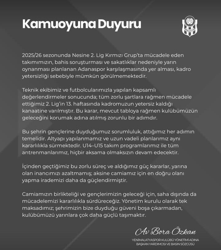 2025/26 sezonunda Nesine 2. Lig Kırmızı Grup’ta mücadele eden Yeni Malatyaspor, bahis soruşturması ve sakatlıklar nedeniyle yarın oynanması planlanan Adanaspor maçına çıkamayacağını resmen duyurdu.
