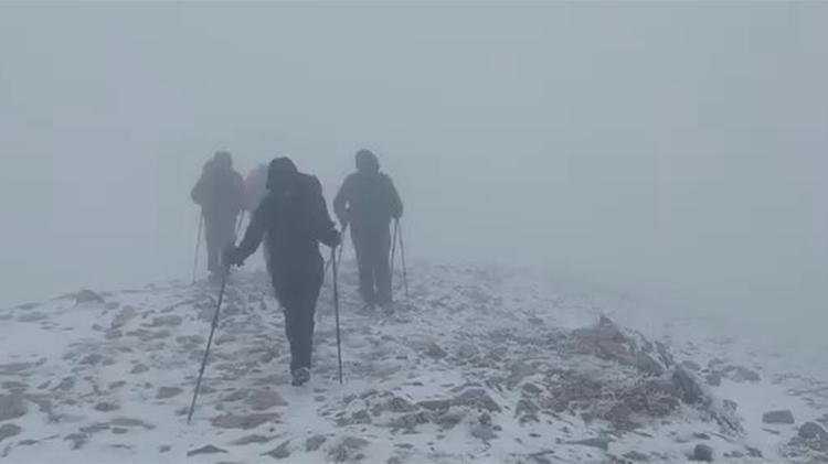 Bursa Yıldırım Dağcılık Kulübü ile Bursa Dağcılık ve Doğa Sporları İhtisas Kulübü üyeleri Uludağ'ın 2543 metrelik zirvesine kış sezonunun tırmanışını gerçekleştirdi. 2543 metrelik zirveye fırtına ve kar yağışı altında yürüyen dağcılar sezonun ilk kar yağışını kutladı.