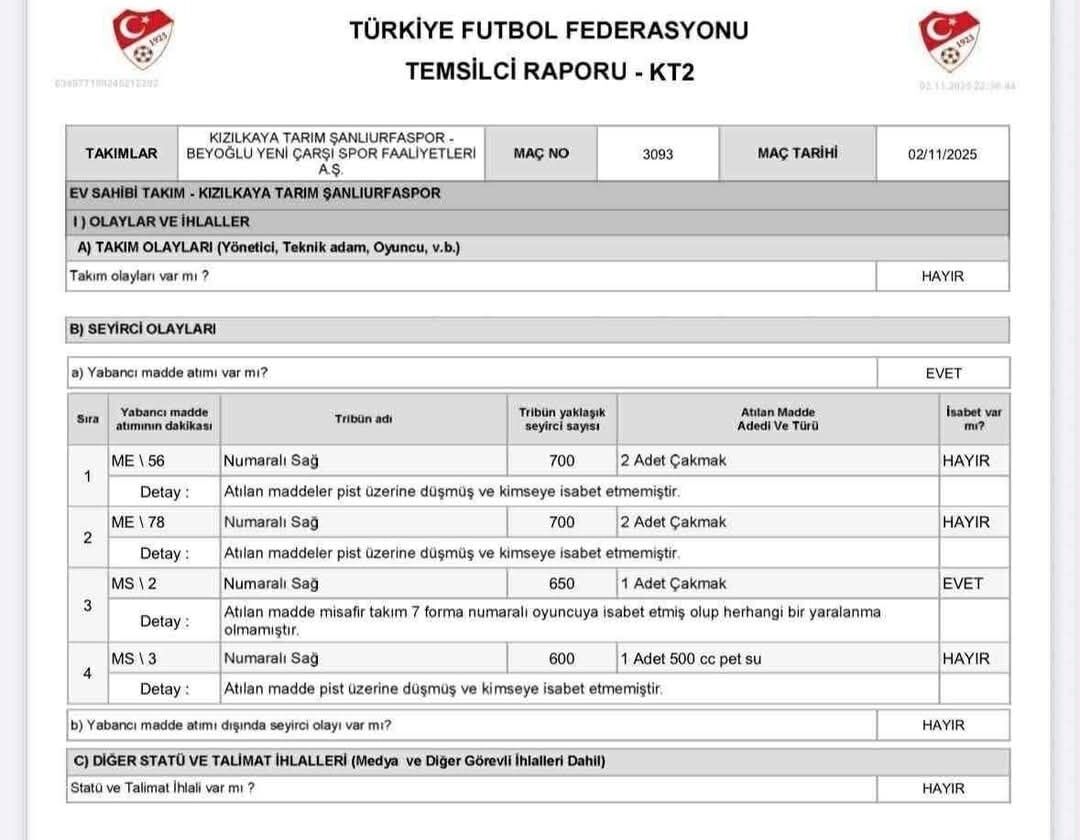 Türkiye Futbol Federasyonu (TFF) temsilcisinin raporuna göre, Şanlıurfaspor’a verilen cezanın nedeni tribünlerden sahaya atılan 5 çakmak ve 1 adet su şişesi oldu.